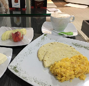Calentado de frijoles con arroz, arepa, quesito, huevo, carne de res o cerdo, café o chocolate.