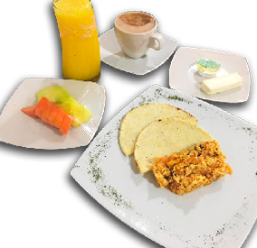 Huevos, porción de fruta, pan, quesito, jugo naranja, café o chocolate.